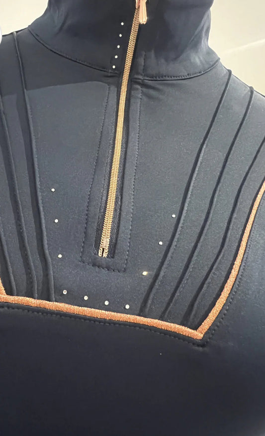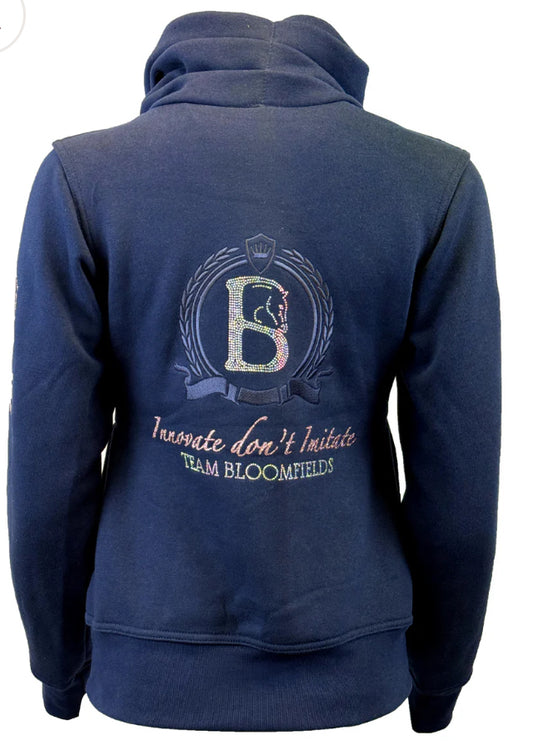 Bloomfields Sabrina ruffle collar zip up top in navy and silver.